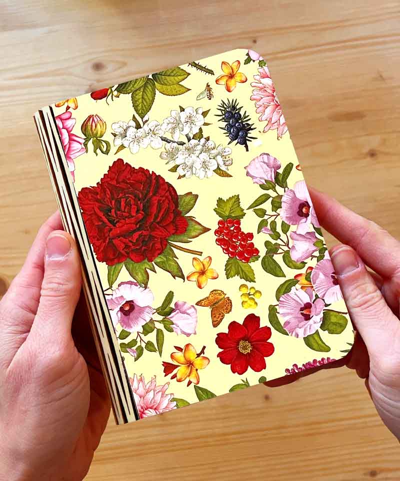 Lampada in legno e carta, pieghevole, senza filo a forma di libro con copertina Botanica. Si accende aprendo il libro e ad ogni apertura alterna 3 tipologie di calore di luce (da fredda a calda). Luce LED ricaricabile tramite USB (cavetto incluso). La copertina in legno è calamitata e questo permette di tenerla aperta a 360°. Sicura e sostenibile: l’esterno è in legno di acero bianco intagliato al laser, mentre la concertina interna è di carta Tyvek, materiale riciclabile, durevole e resistente all’ acqua.
