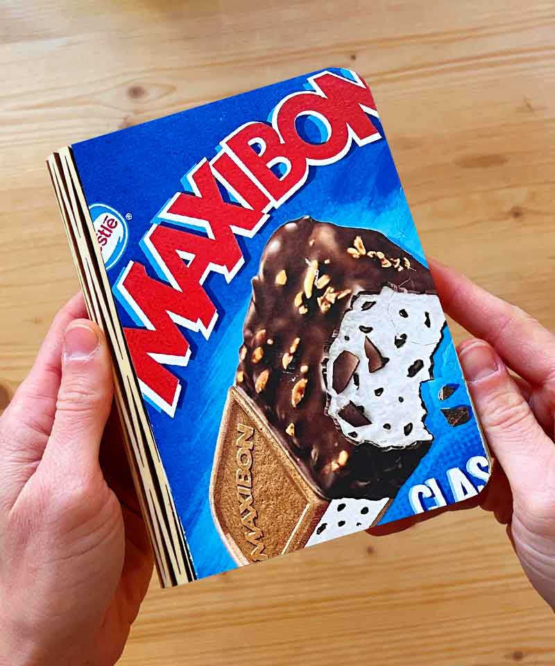 Lampada in legno e carta, pieghevole, senza filo a forma di libro con copertina Maxibon. Si accende aprendo il libro e ad ogni apertura alterna 3 tipologie di calore di luce (da fredda a calda). Luce LED ricaricabile tramite USB (cavetto incluso). La copertina in legno è calamitata e questo permette di tenerla aperta a 360°. Sicura e sostenibile: l’esterno è in legno di acero bianco intagliato al laser, mentre la concertina interna è di carta Tyvek, materiale riciclabile, durevole e resistente all’ acqua.