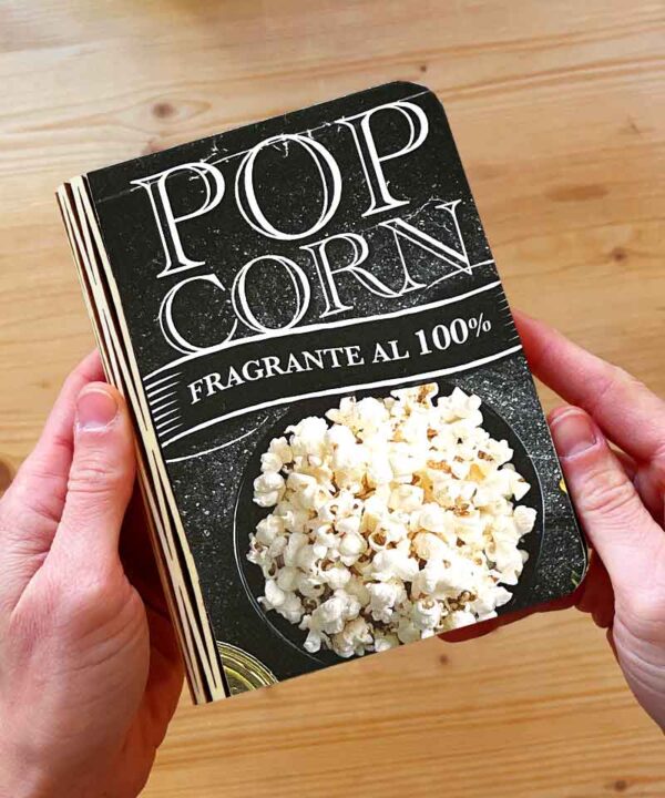 Lampada in legno e carta, pieghevole, senza filo a forma di libro con copertina Pop Corn. Si accende aprendo il libro e ad ogni apertura alterna 3 tipologie di calore di luce (da fredda a calda). Luce LED ricaricabile tramite USB (cavetto incluso). La copertina in legno è calamitata e questo permette di tenerla aperta a 360°. Sicura e sostenibile: l’esterno è in legno di acero bianco intagliato al laser, mentre la concertina interna è di carta Tyvek, materiale riciclabile, durevole e resistente all’ acqua.