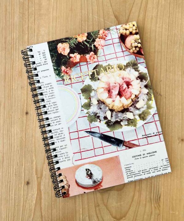 Ricettario in formato A5 stampato su carta riciclata, certificata FSC e rilegata con spirale metallica. Interno stampato a righe con spazio dedicato per procedimento, ingredienti e procedimento delle vostre ricette. Cover realizzate con riviste vintage o materiale di recupero: per questo articolo abbiamo riutilizzato una rivista vintage.